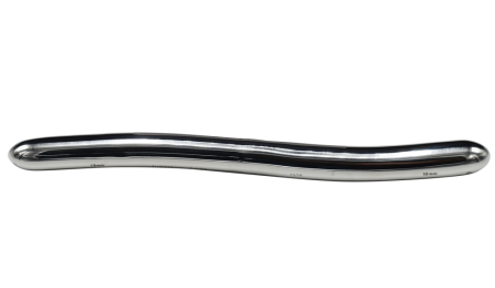 A thin double ended, gently curved metallic uterine dilator.