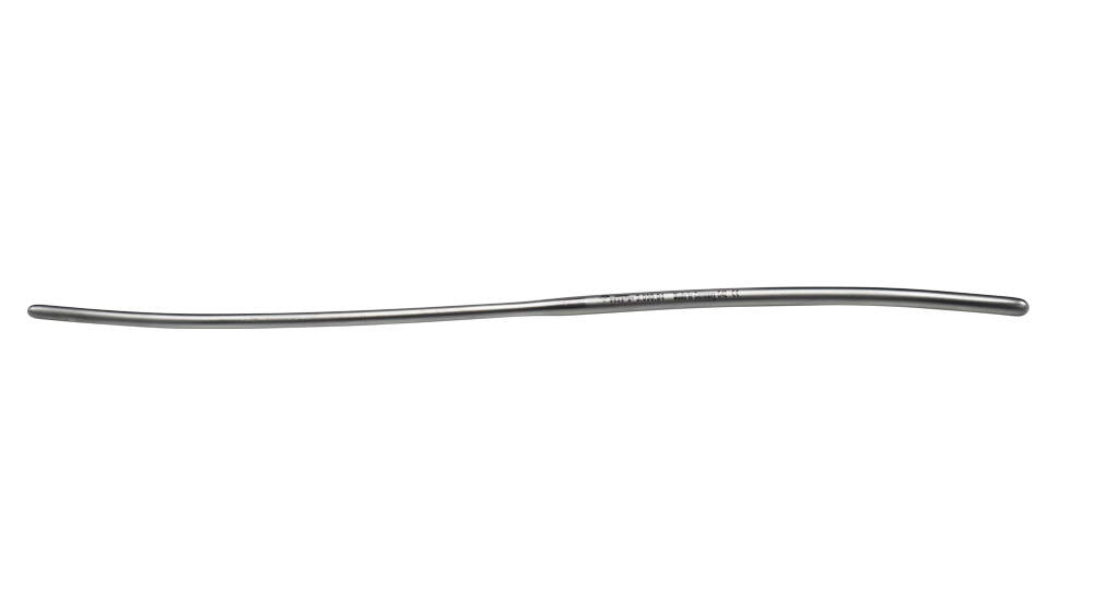 A thin double ended, gently curved metallic uterine dilator.