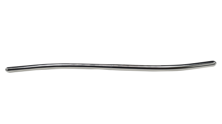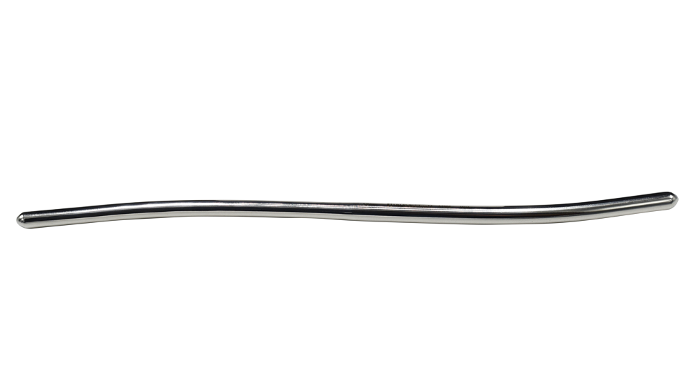 A thin double ended, gently curved metallic uterine dilator.