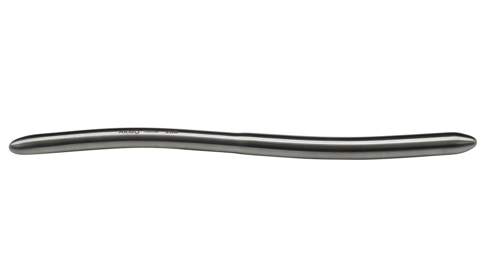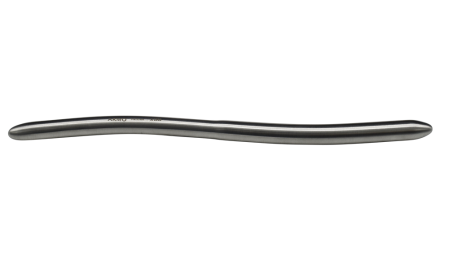 A thin double ended, gently curved metallic uterine dilator.