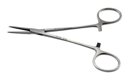 A scissor style haemostatic forceps with a medium length serrated jaw for firm clamping.