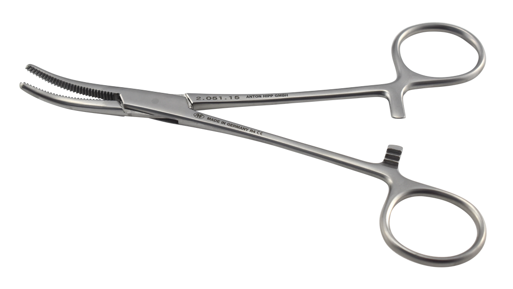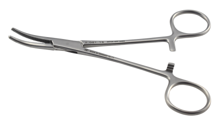 A scissor style haemostatic forcep with large serrated teeth and ratchet clamp.