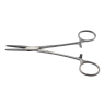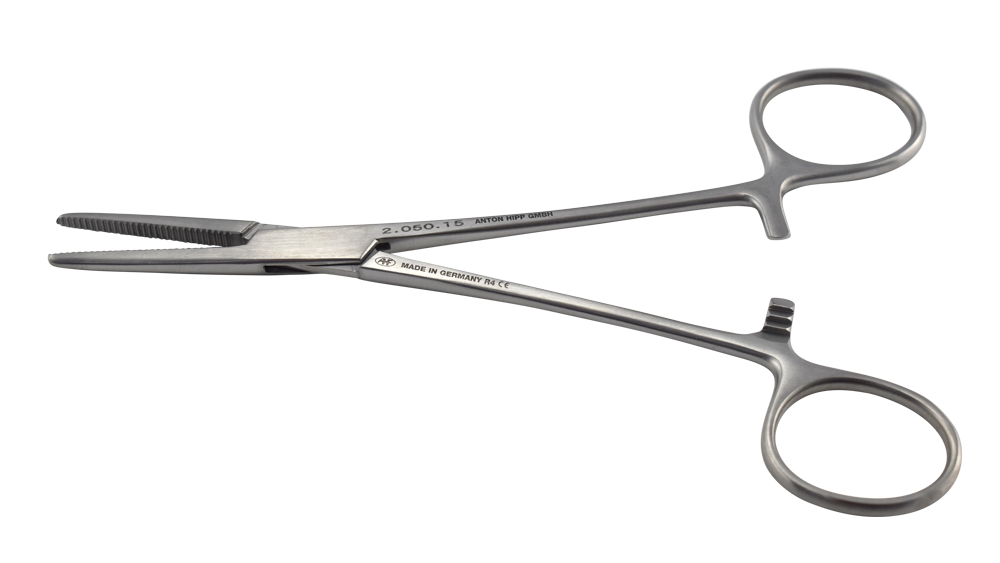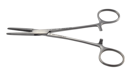A scissor style haemostatic forcep with large serrated teeth and ratchet clamp.