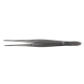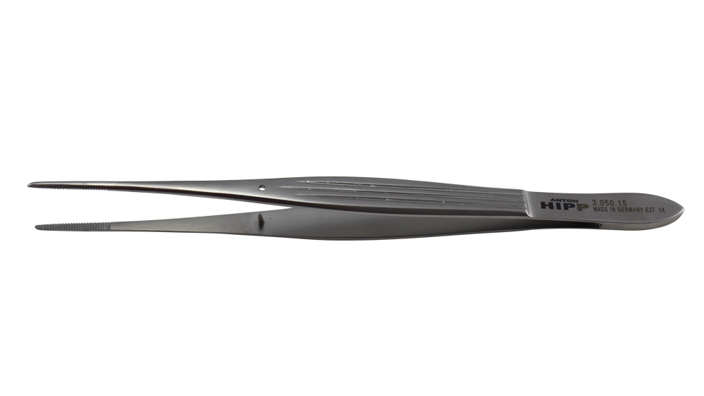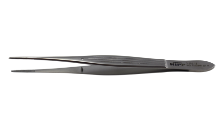 Fine tipped, serrated dressing forceps with an alignment pin and hole.