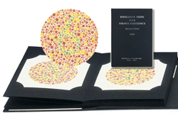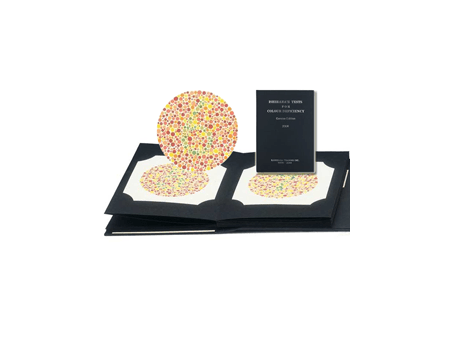 Books consisting of 14, 24 or 38 coloured plates that contain dots in random shapes and various colours to form a specific shape or number that is clearly visible to those with normal colour vision.