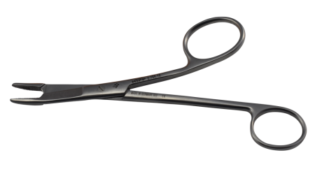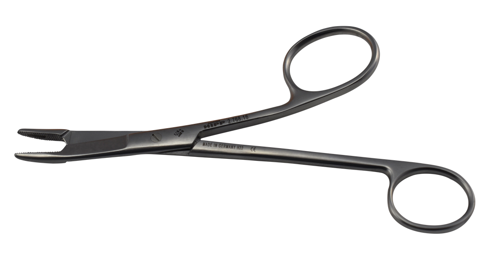 Easily identifiable offset needle holder designed for delicate suturing procedures.