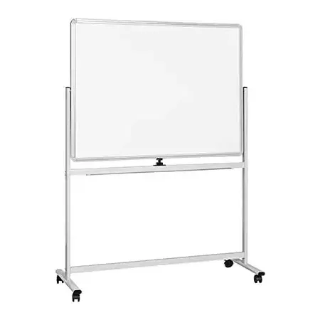 Double sided mobile whiteboard with quality dry wipe writing surface | Steel stand construction with locking castors | Board pivots 360 degrees with middle locking mechanism | Ideal for meetings areas and training applications | Magnetic surface | Board pivots 360 degrees | Steel stand with locking castors | 2 year surface warranty