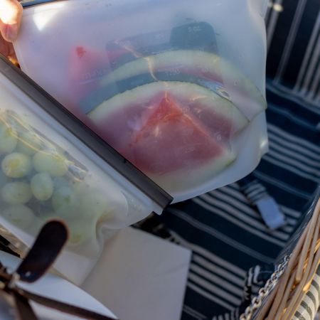 The 3 litre pouch is amazing for preparing marinated meats, cut up fruit, salads in a large quantity. Being totally leakproof they can be easily transported without worrying about spillage.