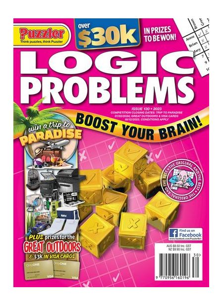 If pure logic and giving your grey matter a thorough work-out is your idea of puzzle heaven, then Logic Problems is the puzzle magazine for you! Each issue is packed with 50 entertaining and challenging puzzles spread across 64 pages. Never has cold hard logic been more fun. Follow a story, deduce the facts, and tick off what’s true and what’s false in a special grid. But beware of the baffling linguistic turns of phrase! Can you work out what’s fact and what’s fiction? Have you the brain power to cross-reference facts to reach a unique solution? For new readers, there are guides to solving the simpler puzzles in each issue. And, in addition, each puzzle comes with a comprehensive text solution, should you get stuck. This fun magazine also includes an array of other classic logic puzzles, including: Pixel Puzzles (a pixelated picture-forming puzzle), Enigma (a mind-bending Japanese puzzle of logical trails), Battleships (the classic find-the-fleet puzzle), Logi-5 (an early version of an irregular Sudoku puzzle), Sudoku, and Domino Search, based on the classic tile game. As each issue is also packed with some fabulous big-prize competitions, Logic Problems is the logical conclusion to any hunt for pure logistical fun. Please allow up to 6-9 weeks for your first delivery.##